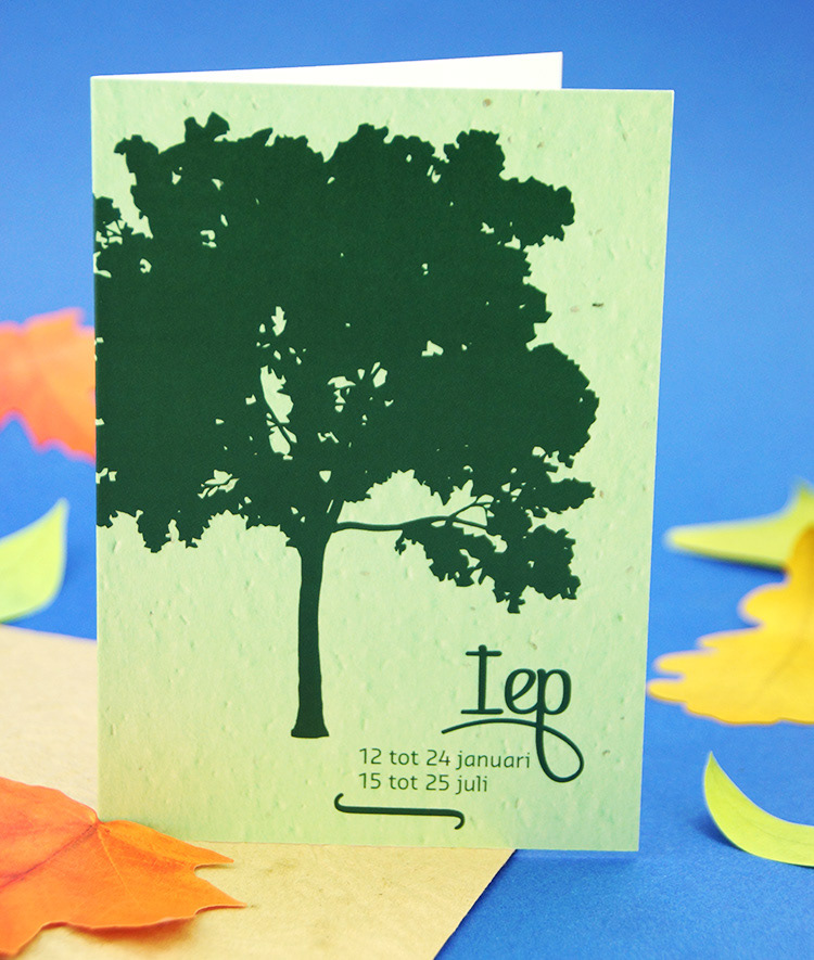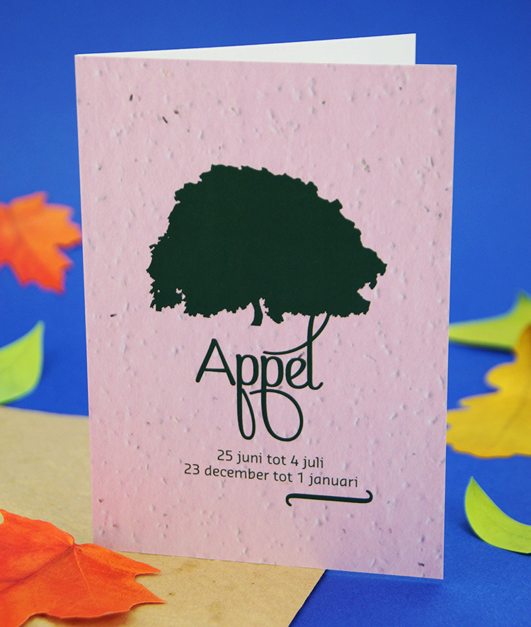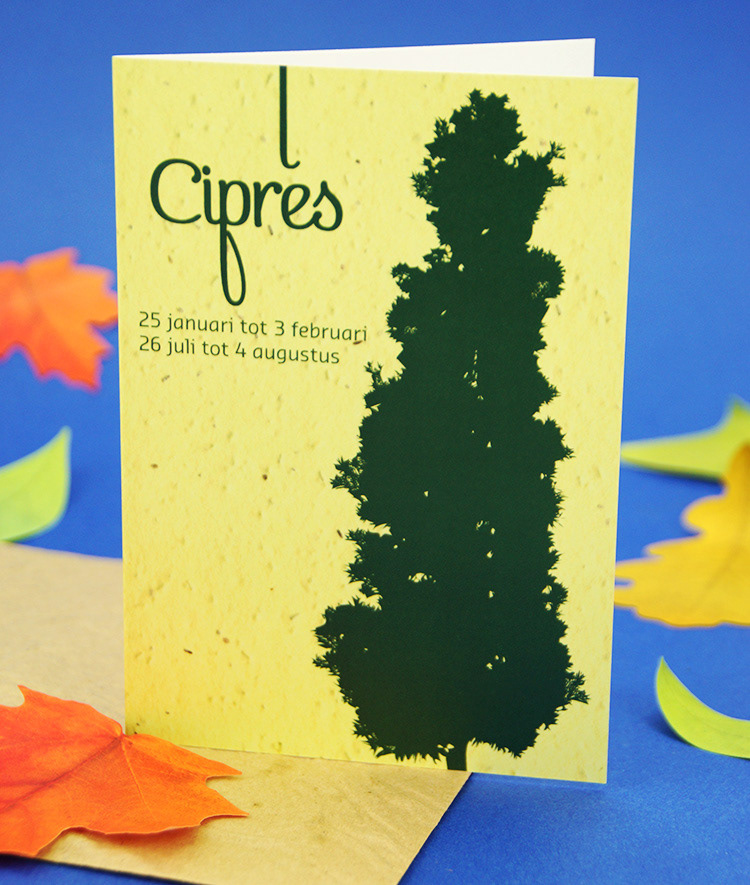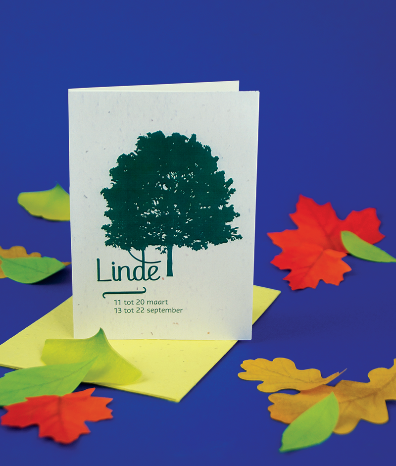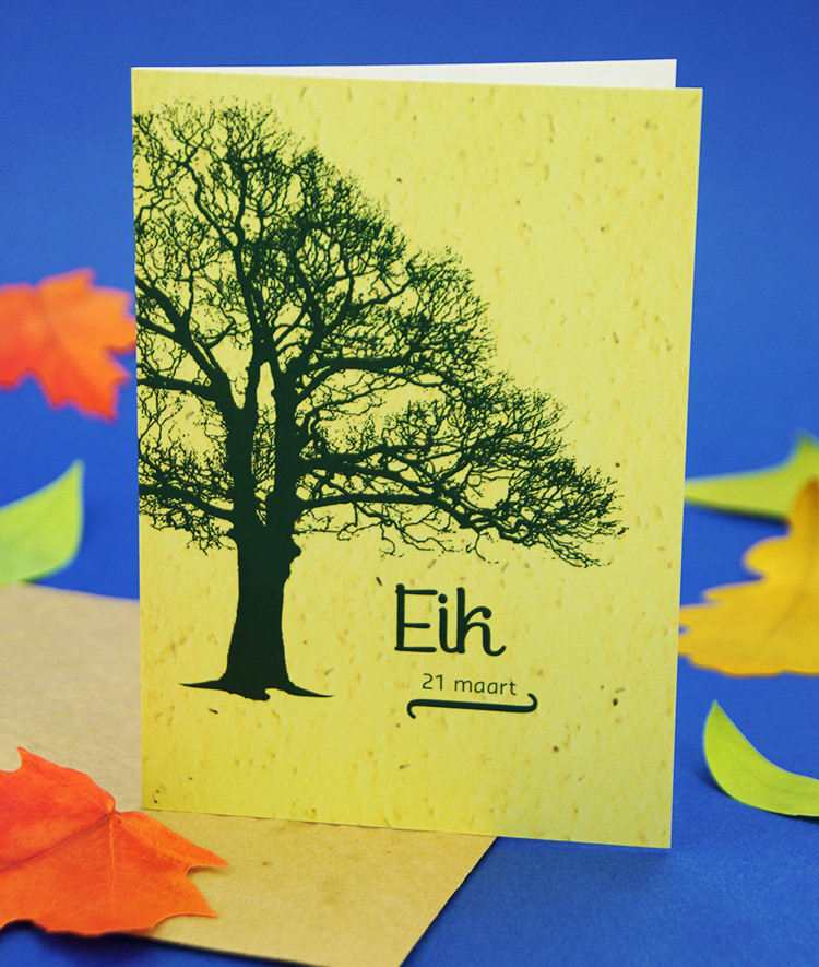 Kies één van de 21 boomkaarten met plantbare enveloppe voorzien van bloedzaadjes. Binnenin is de kaart blanco met plantinstructies. In een apart vel kom je meer te weten over het karakter van mensen geboren in de heersende periode van deze boomsoort.