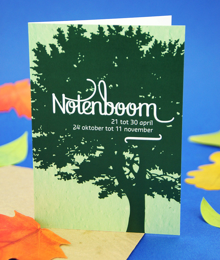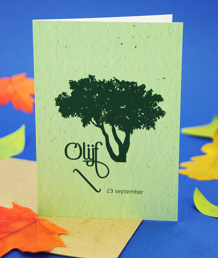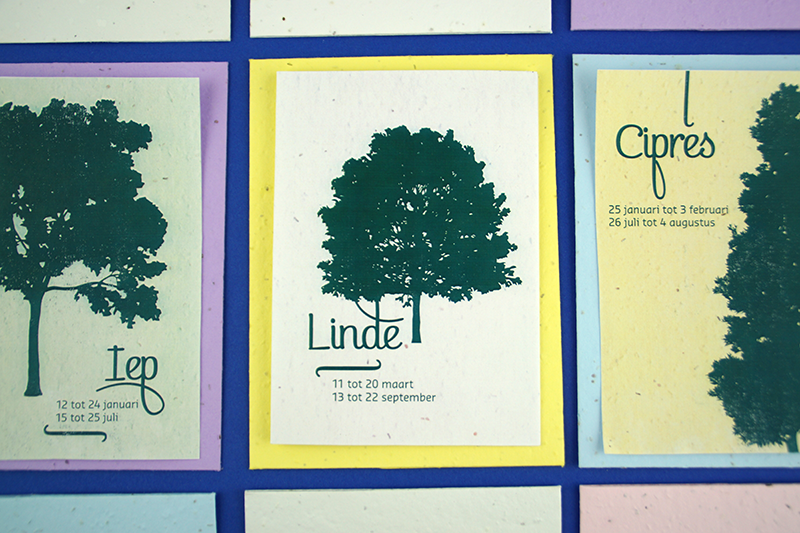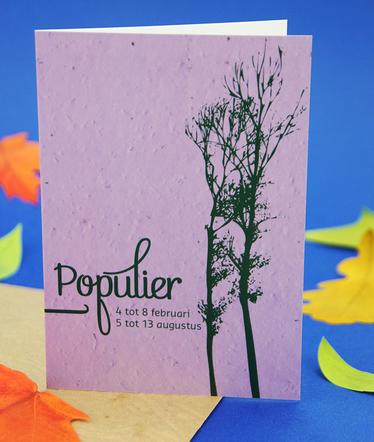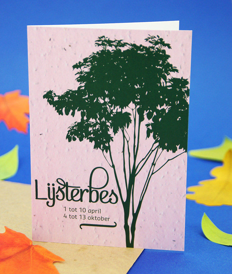 Kies één van de 21 boomkaarten met plantbare enveloppe voorzien van bloedzaadjes. Binnenin is de kaart blanco met plantinstructies. In een apart vel kom je meer te weten over het karakter van mensen geboren in de heersende periode van deze boomsoort.